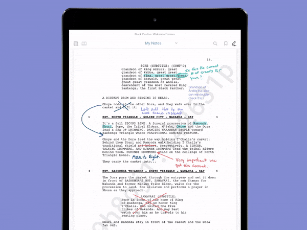 Users love accessing, reading, and annotating their script in ProductionPro, and the ability to share notes with others has introduced a new way to collaborate efficiently. We know all too well how the transition from paper scripts to digital scripts has been a frustrating dance: one step forward and two steps back. The promise of speed and ease of using digital scripts hasn’t quite lived up to the crew’s expectations. In fact, for the many who prefer scribbling notes on their paper script, it has been a curse. First, they had to find a new way to annotate their script; then, the inability to insert and replace pages into a collated script meant that users either had to painstakingly re-annotate the new revision or give up their previous notes. With note transfer, that’s no longer the case! It adds to the list of reasons why users already love accessing, reading, and annotating their script in ProductionPro: